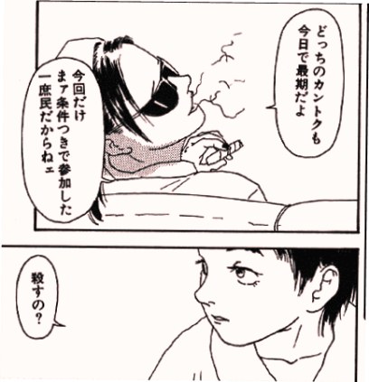 「地上∞階美少女売場」タイトルが本編と関係ありそうで無い。自称ロリコンが飛び降りようとしてたらエレベーターが止まるという、まああるよねwという流れ。贅沢に品定めしていたら事故でそれどころじゃなくなり、結局ブスか…まあしゃあねえと残念に展開した後、屋上での2人の掛け合いが素晴らしい。これ1頁丸々使っていて長いんで省きますが、こんな事言ってます