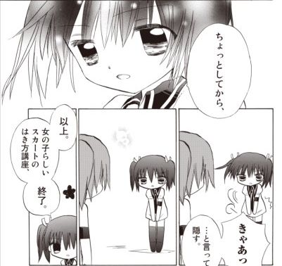 女の子は皆ぷに萌えな絵柄ですごく (・∀・)イイ!! んですが何とボケツッコミ要素皆無・ギャグ皆無・決めポーズ皆無・ラブロマンス皆無・ツンデレその他属性キャラ皆無たる衝撃の内容。ストーリーが一貫して真摯に展開していきます。本当にゼロ年代後半の作品??